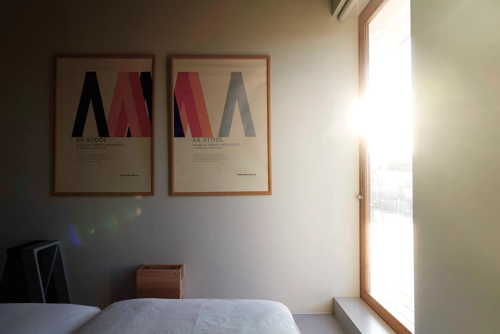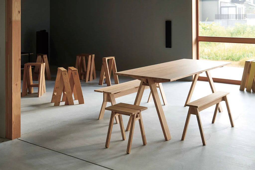大きな専用テラスが付いた宿泊室には、トラフが石巻工房のためにデザインしたAA STOOL、AA DESK、ISHINOMAKI BIRDなどがならび、宿泊室のために新たに作られたランプシェード、TAKIBI LIGHTが暖かさを添えます。