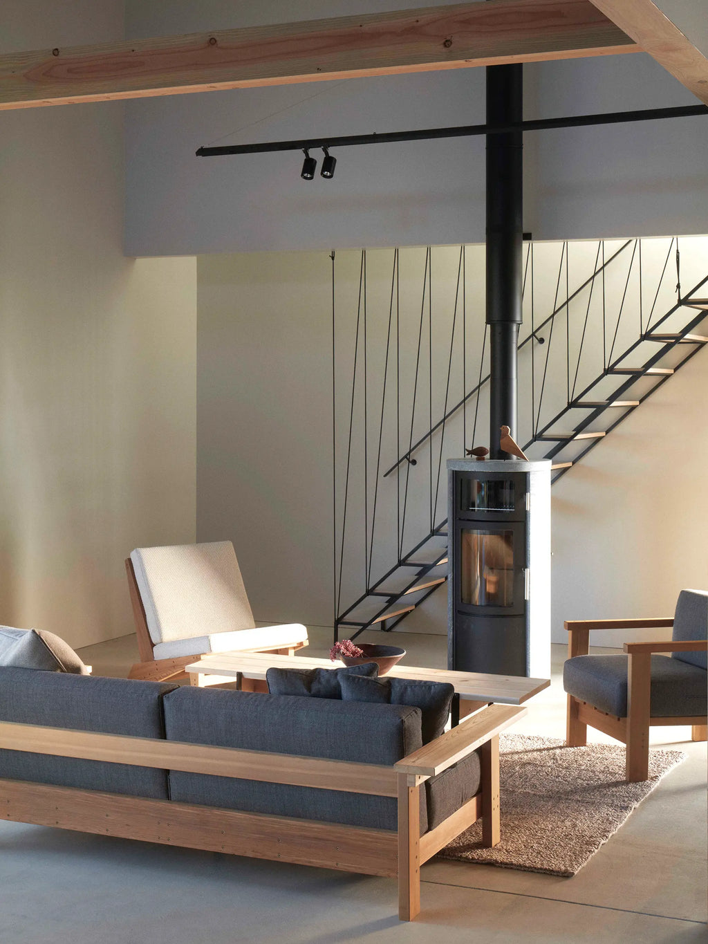 初めてこの部屋に入った時、大屋根の「軒」の下に居るような心地良さを感じました。なので、ここを訪れる方々には、いつもより少し上を向いて寛いで欲しいと思いました。屋根と同じ傾きのペンダント照明は、そのためのきっかけとして佇んでいます。