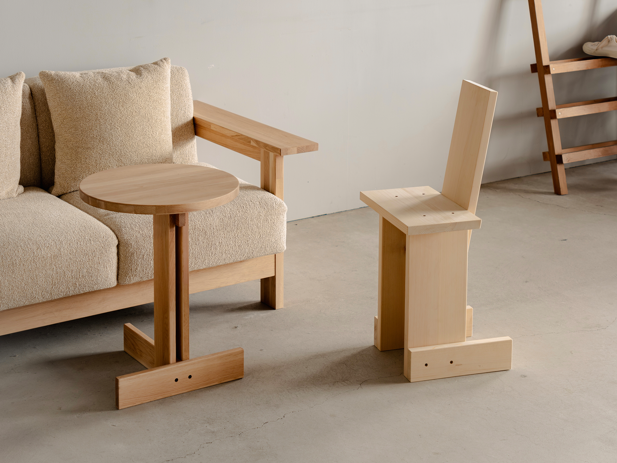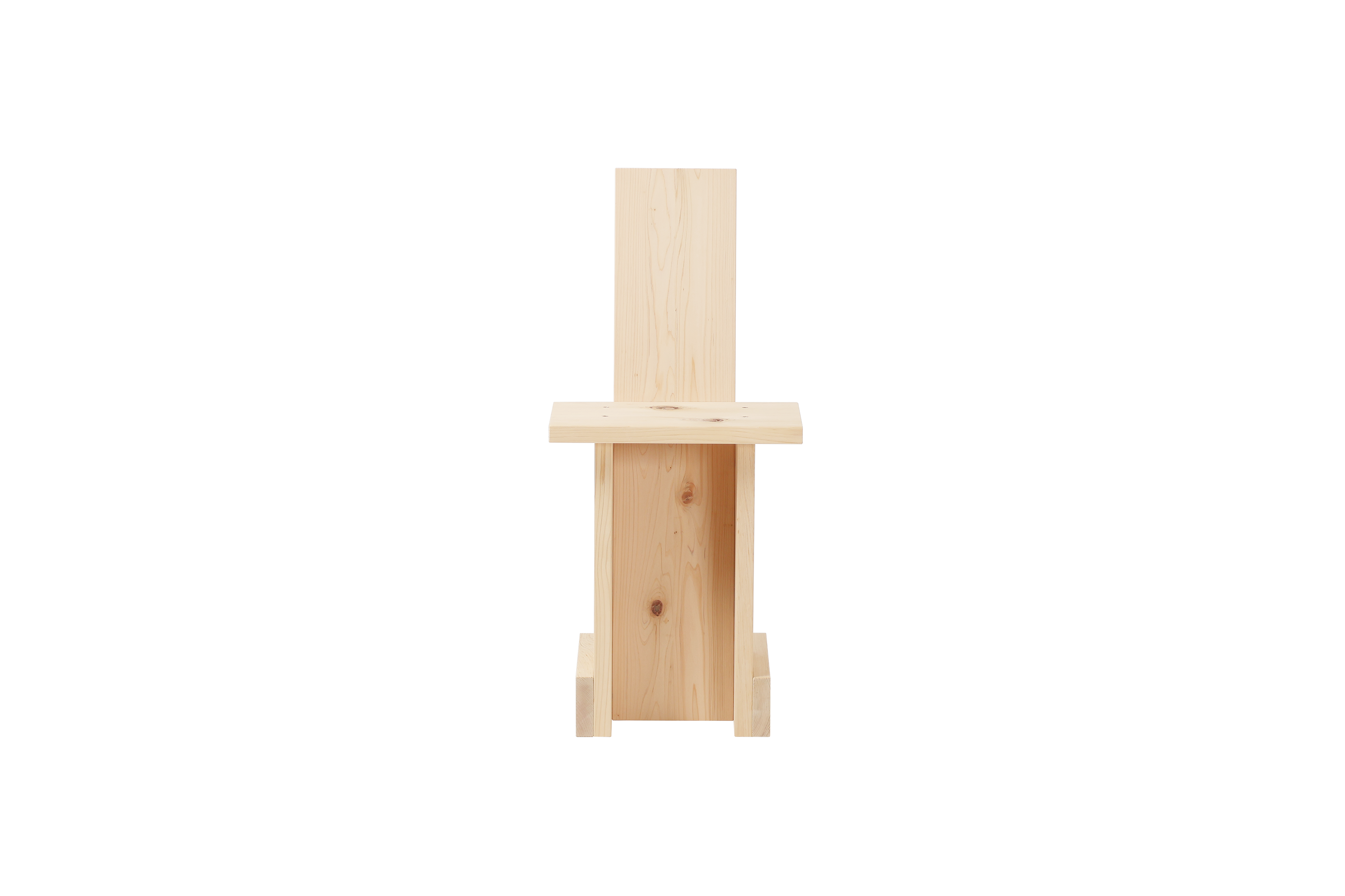 可能な限りシンプルな構造で作られた、小さなオケージョナルチェアです。彫刻的な感覚を持ち、石巻工房のオリジナルデザインを踏襲しています。構造上、90度のカットのみで組み立てられており、石巻工房シリーズに共通する特徴的な黒いネジで固定されています。ヒバ材を使用したこの椅子は、頑丈で安定感があり、設置面積も非常に小さいです。ちょっとした休憩や、腰掛け、そして思索のひとときを過ごす場所として、狭い空間に最適です。