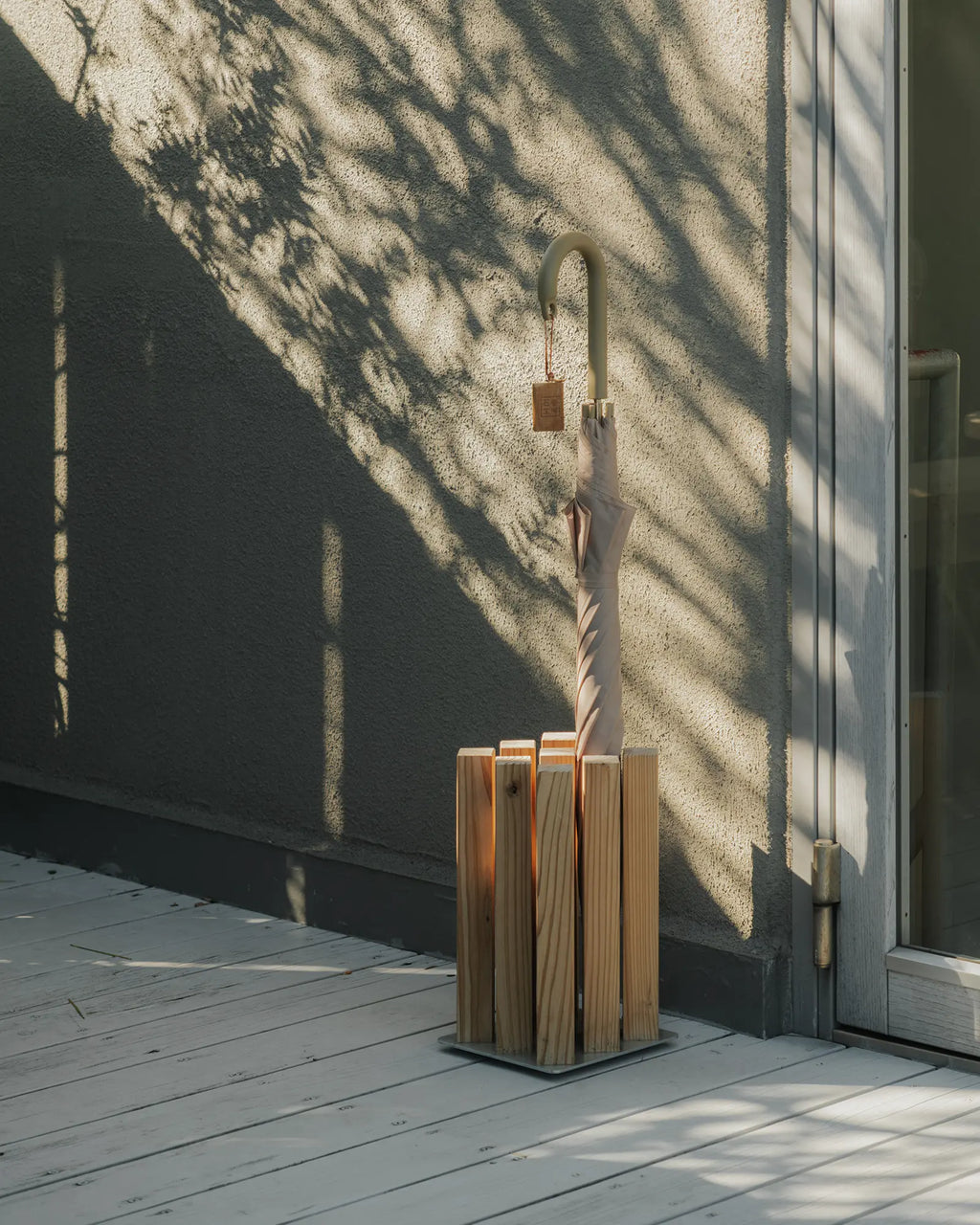 防錆加工を施したスチールプレートに2x2材(38x38mm)を規則正しく立てて傘立てを作りました。240x240mmのスペースに最大9本の傘を効率よく且つお行儀よく収納することができます。1台ならばコンパクトな住宅の玄関で、また2台3台と連結することによってパブリックスペースや大空間のエントランスにも対応することができます。