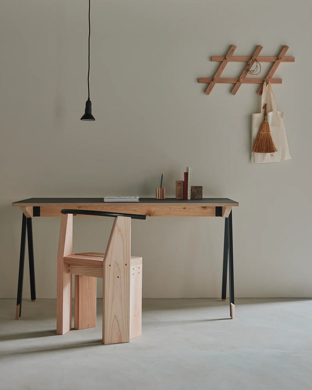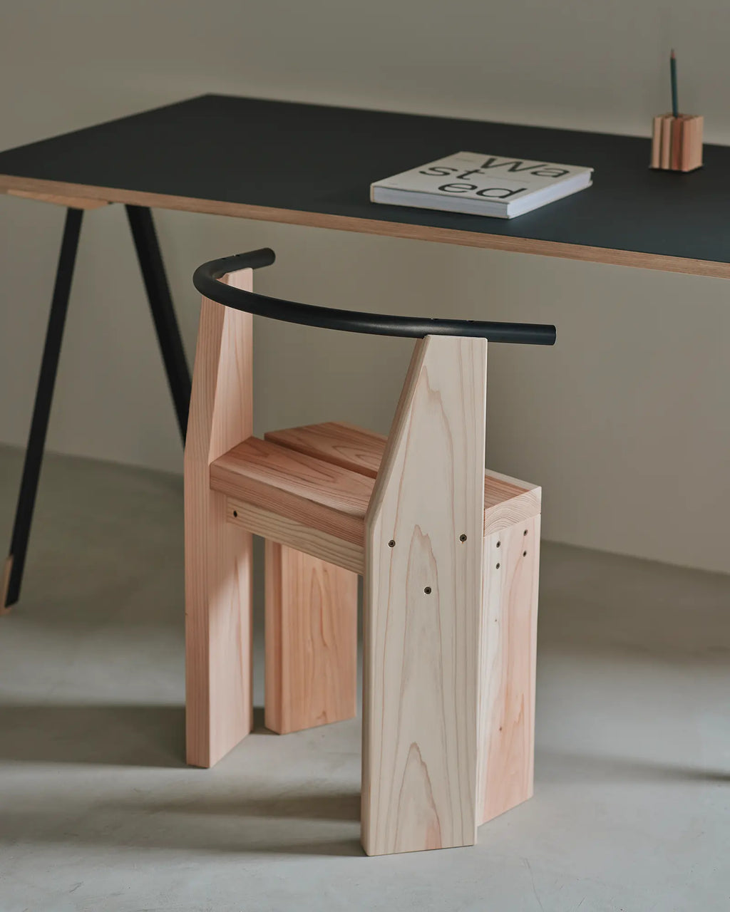 素材の寸法を尊重して設計された、幅広のチェア。コンパクトで安心感のある形状を意識してデザインされています。奥行きよりも幅が広く、前寄りに重心を保つ堅牢な構造により、高い安定性を実現。背もたれには、一本のスチールパイプを緩やかなカーブで用い、開放感のあるアームを形成しています。カウンター下にすっきりと収まるよう、小さな空間を想定してつくられました。
