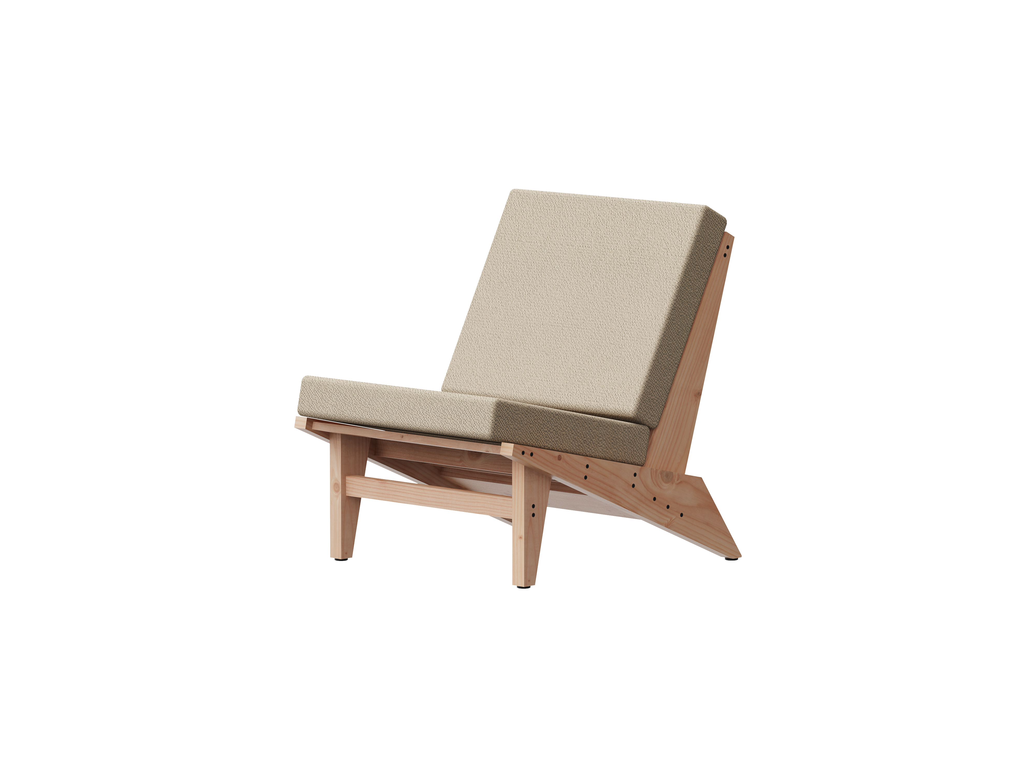 The 105° LOUNGE CHAIR was designed based on standard lumber measurements that nonetheless adhere to the philosophy of ISHINOMAKI LABORATORY. Straight cuts and simple assembly techniques make this an honest piece of furniture that typifies our DIY design language and creates a welcoming 1976 660 atmosphere in any interior. Despite the scaled proportions and thick upholstery, the chair has a small footprint that can accommodate modern and small living spaces.